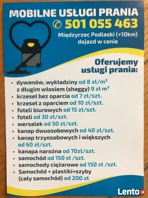 - Zakres usług:Pranie dywanów, Pranie tapicerki meblowej, Pranie tapicerki samochodowej